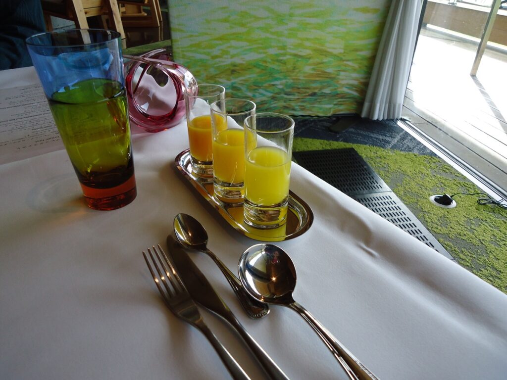 この美味しいフレッシュジュースからスタートです。洋食、和食どちらを選んでも出てきます。